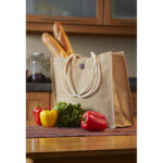 Bolsa con fuelle y asas redondeadas. Interior plastificado. Boton de madera al frente para cerrar. El yute es un producto natural el cual puede presentar variaciones en tonalidades y en la urdimbre y trama de la tela. INFORMACIÓN BASICA CATEGORÍA: BOLSAS ECOLOGICAS MATERIAL: Yute TAMAÑO: 45.5 x 34 x 14 cm