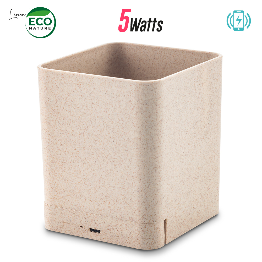 Cargador inalámbrico de 5W en la base, plástico con material ecológico de fibra de trigo, portabolígrafos y 3 salidas USB (aptos para carga y para transmisión de datos cuando se usa con el cable que está incluido). Empaque caja individual. Medidas: 8.5 cm x 8.5 cm x 10 cm Marca: 5.5 cm / Tampografía