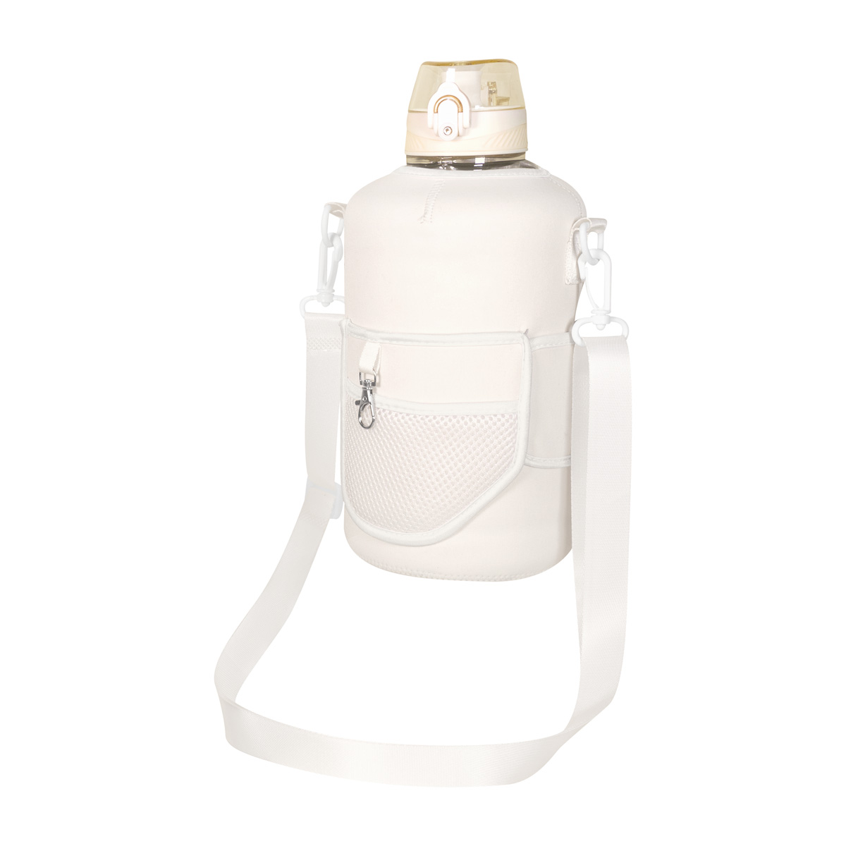 Cilindro con pared sencilla de plastico. Incluye funda removible de neopreno. Tapa de plastico con sistema de rosca y sobretapa que agrega un clip de seguridad para evitar derrames. Su tamano esta disenado para quienes necesitan llevar una gran cantidad de agua de manera practica, es perfecto para actividades intensas, largas jornadas o aventuras al aire libre, asegurando que nunca te falte agua. Los bolsillos de su funda, te permiten organizar tus articulos esenciales y no perderlos de vista mientras te ejercitas y su correa ajustable lo hace ideal para llevarlo contigo sin mayor esfuerzo. INFORMACIÓN BASICA CATEGORÍA: CILINDROS DE PLASTICO MATERIAL: Plastico / Neopreno TAMAÑO: 13.6 x 29 cm CAPACIDAD: 2.2 Litros