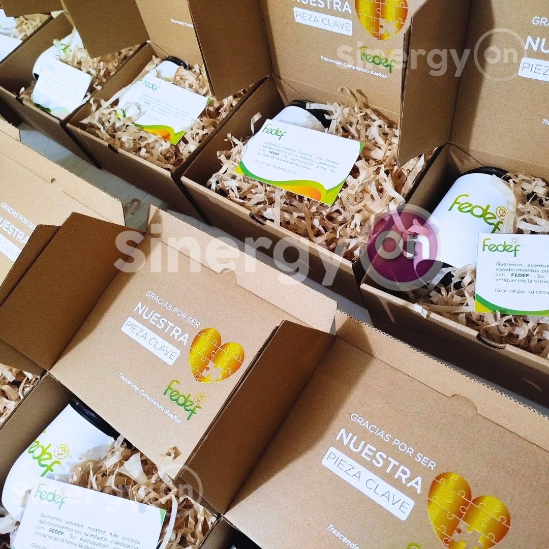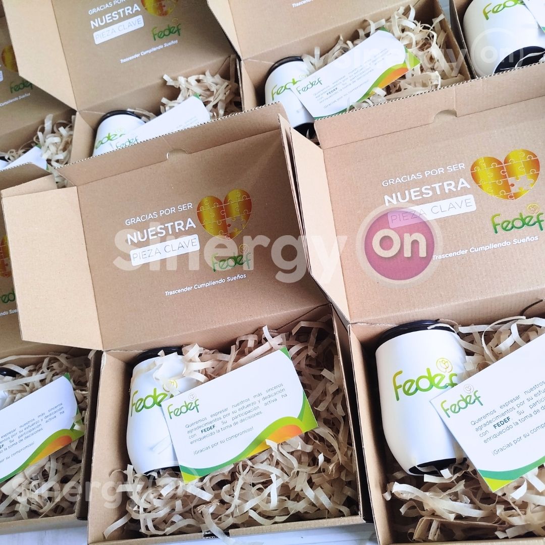 Kit corporativo FEDEF que incluye productos útiles y de calidad para colaboradores y clientes. Presentación cuidada y diseño alineado a la identidad visual de la empresa. Materiales: cartón rígido, mug para bebidas calientes, agenda personalizada.