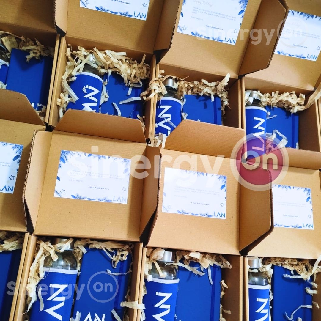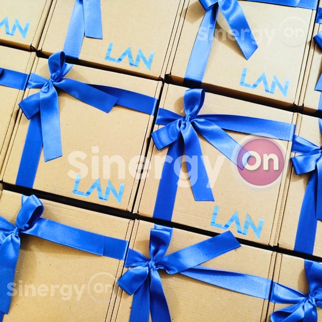 Kit corporativo LAN con productos seleccionados para impactar en eventos y presentaciones comerciales. Materiales: cartón rígido, agenda personalizada, botella de vidrio con funda marcada.