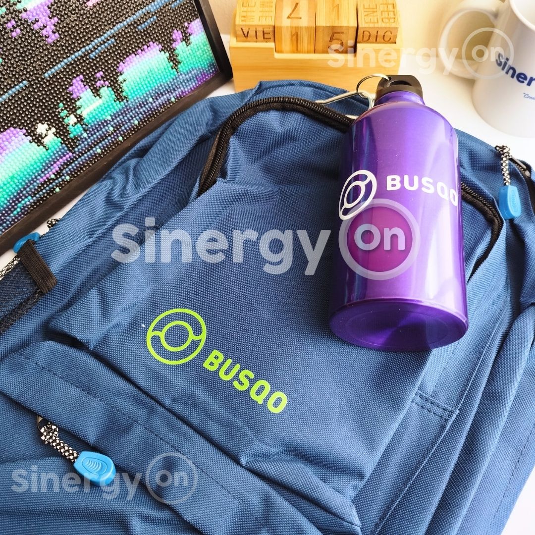 Kit corporativo BUSQO que incluye un morral personalizado y artículos prácticos para uso diario. Fabricado con materiales resistentes y de diseño moderno.