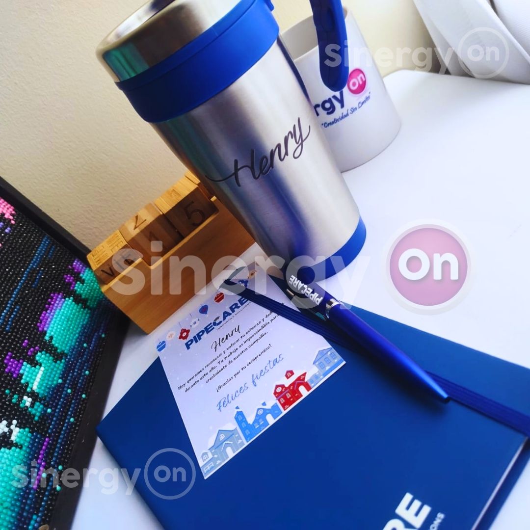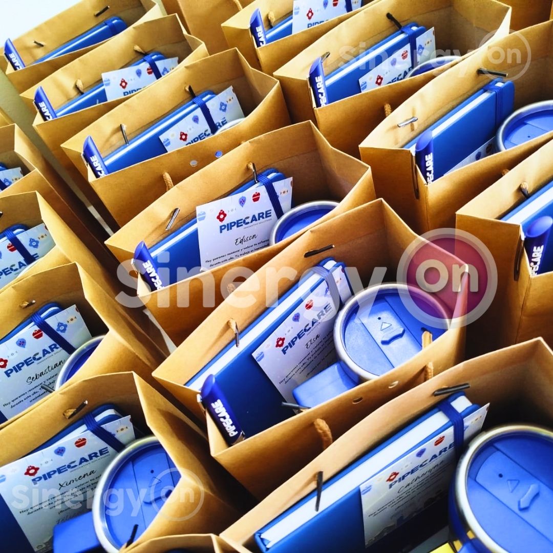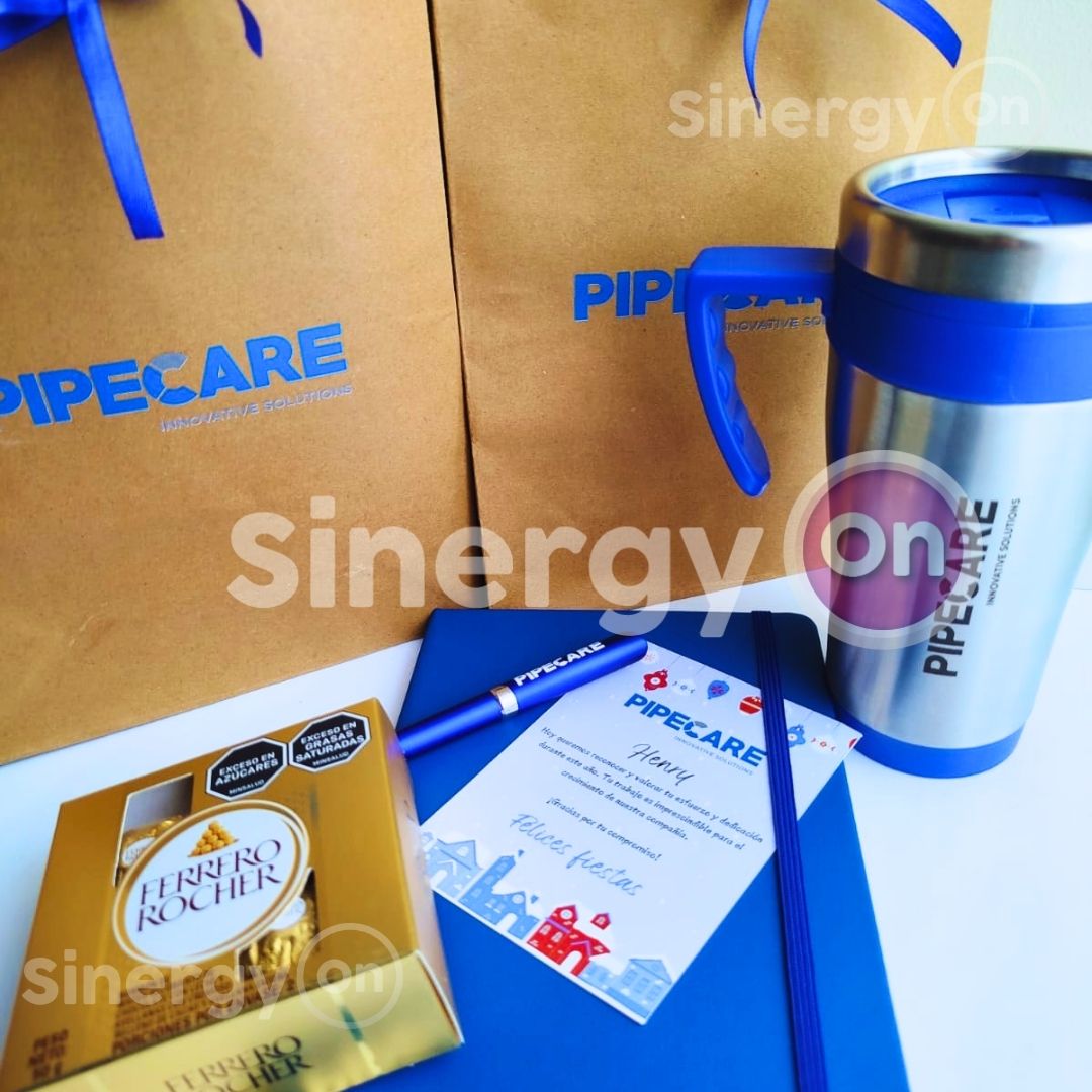 Kit de bienvenida PIPECARE que ofrece una experiencia de onboarding única con artículos prácticos y de calidad. Materiales: cartón rígido, mug en acero, boligrafo personalizado, chocolates ferrero y tarjeta personalizada con nombre.