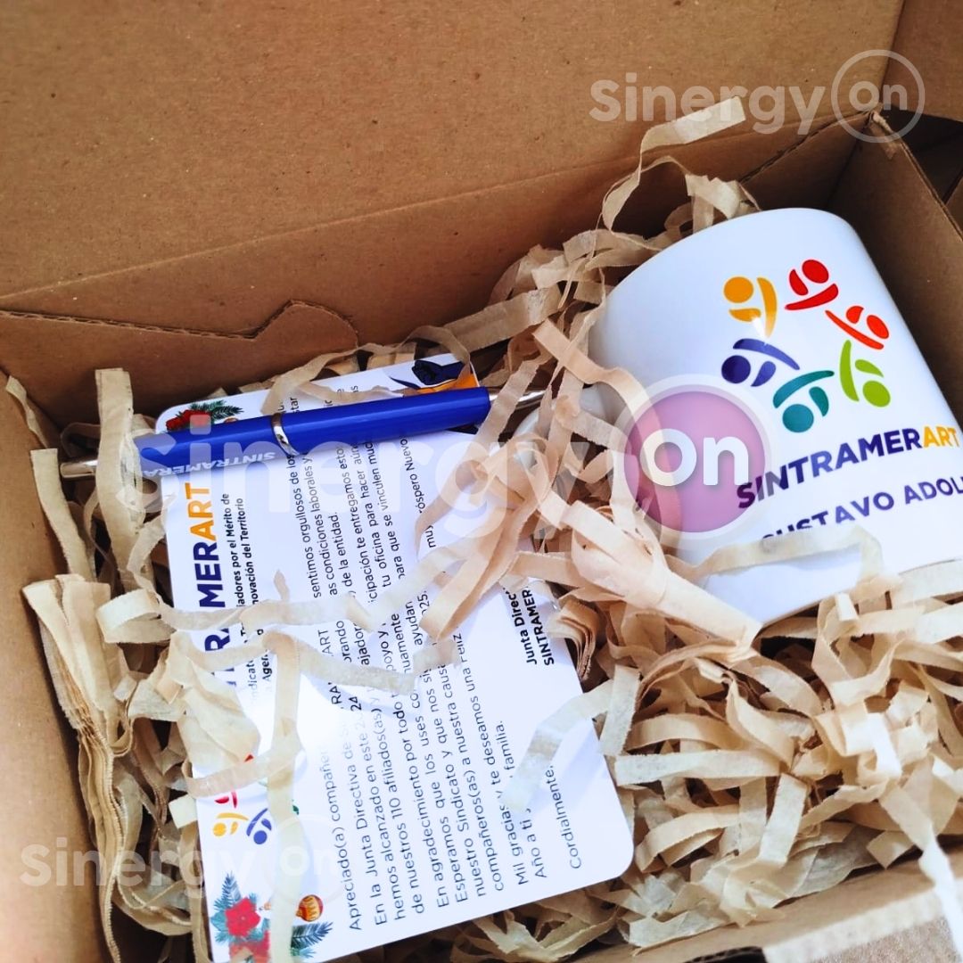 Kit de regalo empresarial SINTRAMERART que incluye productos personalizados y de alta calidad, ideales para fortalecer relaciones comerciales y sorprender a colaboradores. Materiales resistentes, agenda personalizada, mug full color 11 oz y boligrafo personalizado.
