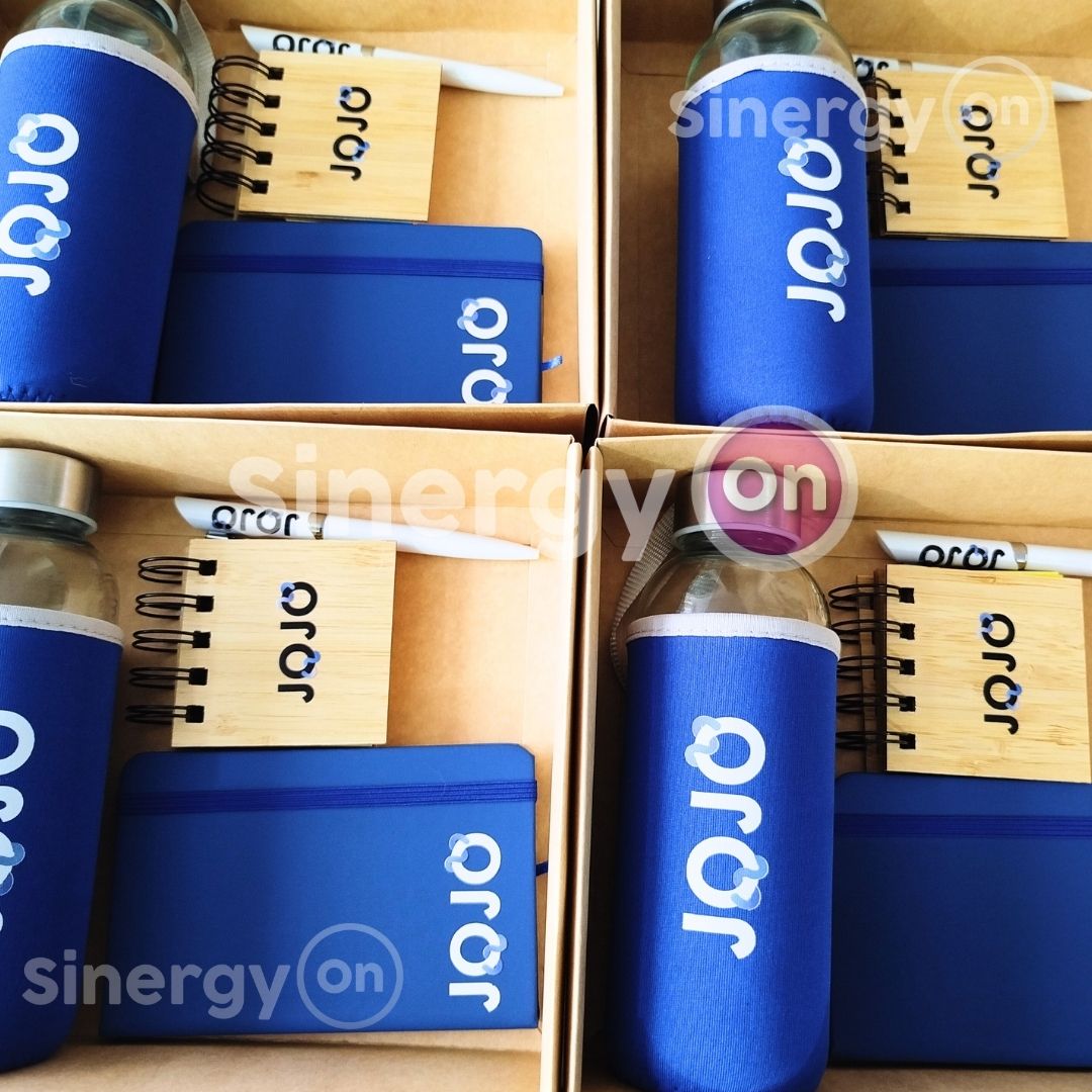 Kit empresarial JOJO con artículos personalizados para uso diario, pensado para reforzar la identidad de marca y ofrecer practicidad: caja de cartón, camisa polo, agenda personalizada, set de memos, botella con funda personalizada.