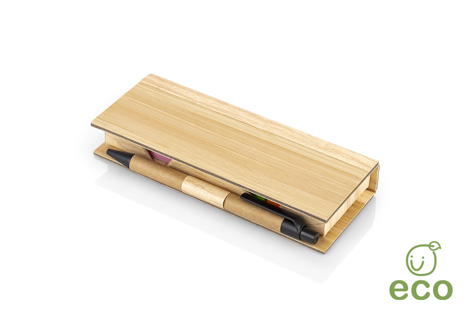 Estuche de Bambú con bolsillo para regla de 12 cm, 2 memos de color con 110 hojas c/u y 5 banderas adhesivas en papel de diferentes colores. Incluye bolígrafo ecológico y porta bolígrafo.
