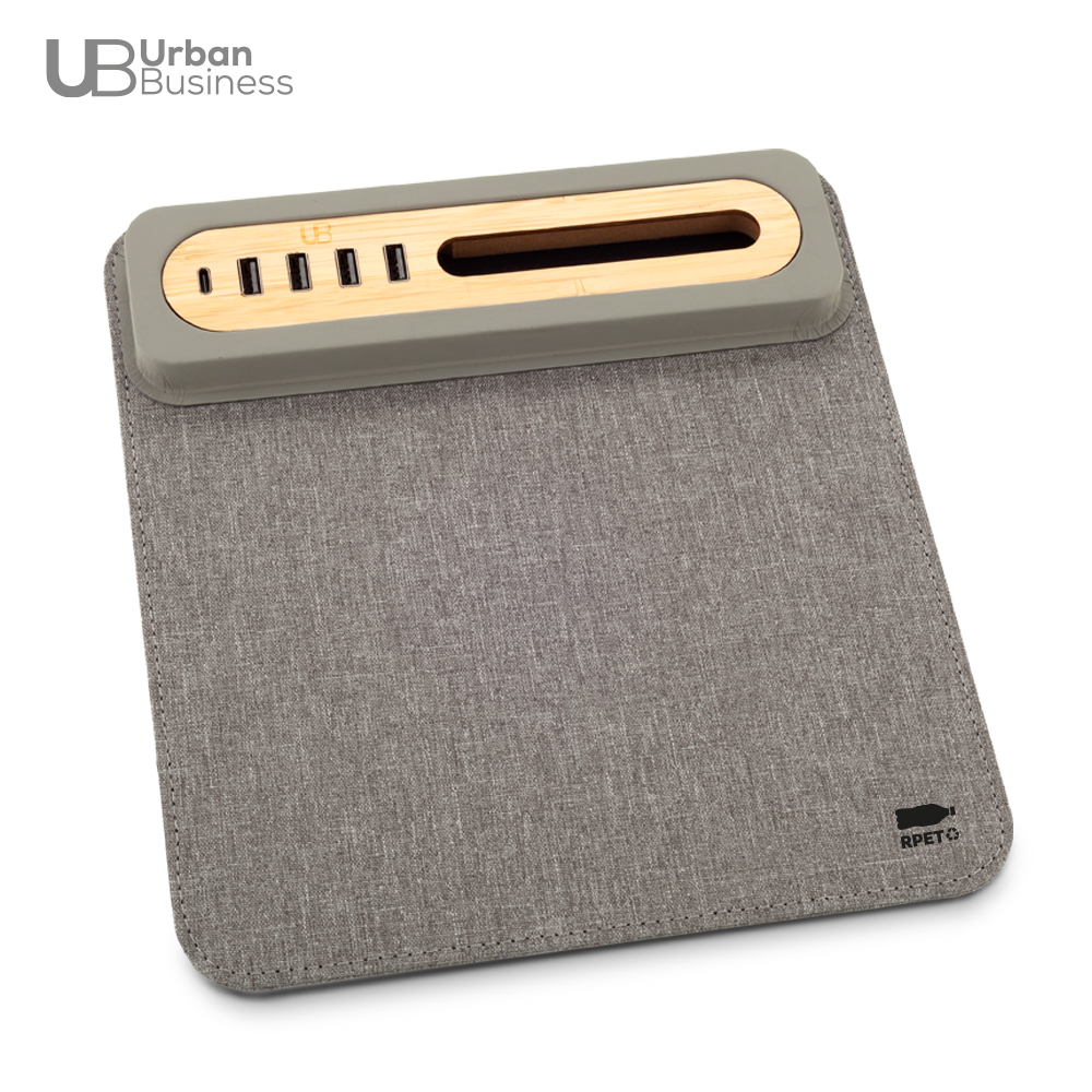 Mouse pad en poliéster reciclado RPET. Cuatro puertos Tipo USB, un puerto Tipo C y soporte para el celular en bambú. Empaque caja individual. Medidas: 24.1 cm x 22 cm. Marca: 10 cm / Screen.