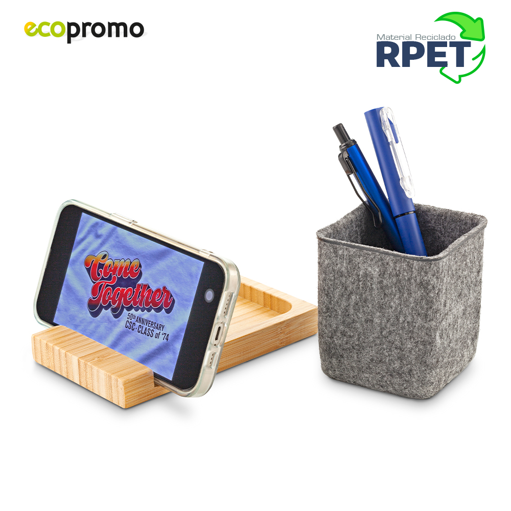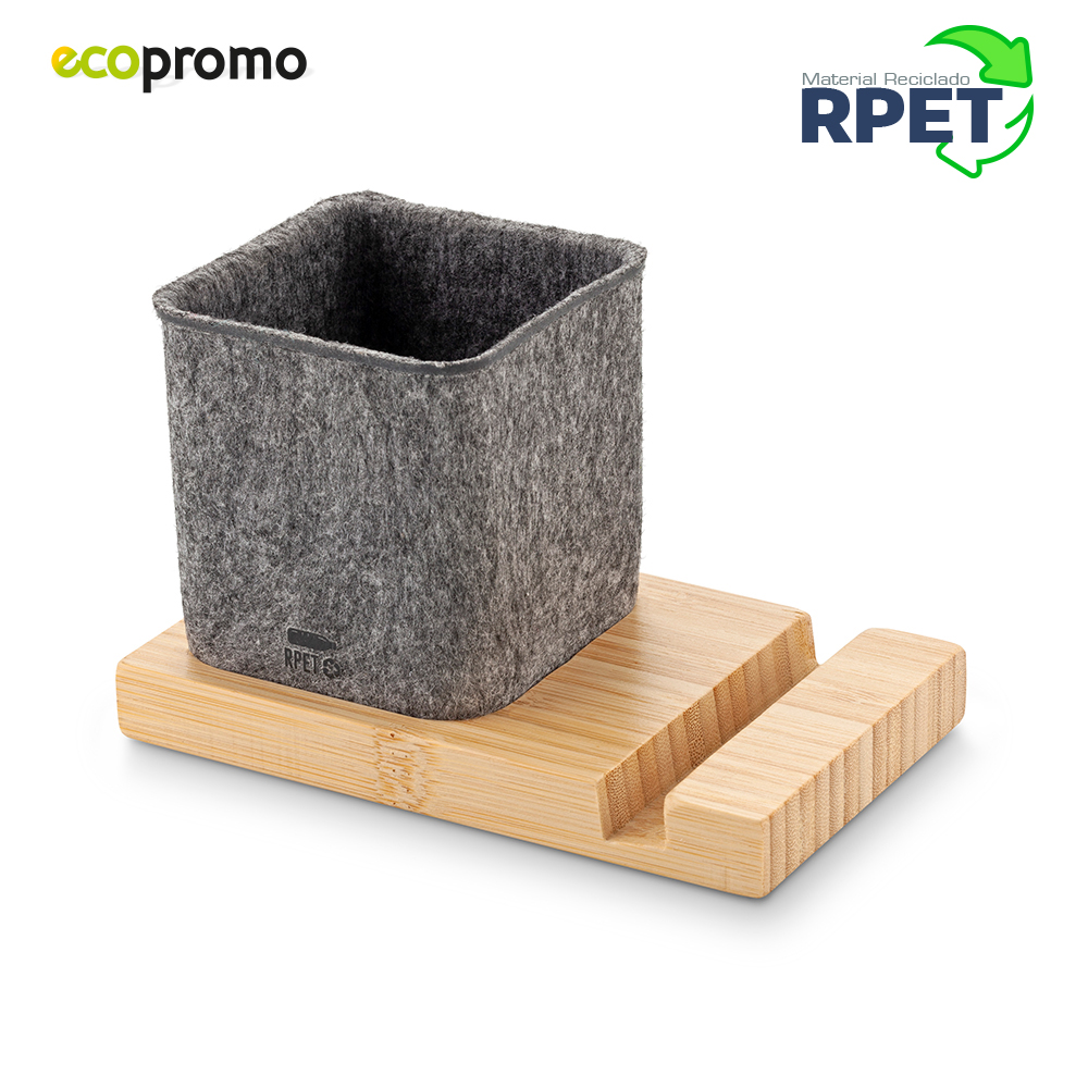 Portabolígrafos en RPET reciclado y base en bambú. Con soporte para celular. Empaque caja individual. Medidas: 14 cm x 8.3 cm x 8.8 cm. Marca: 3 cm / Láser.