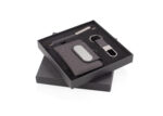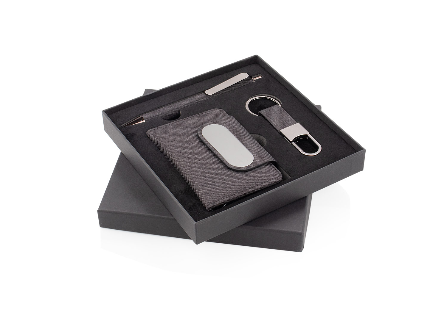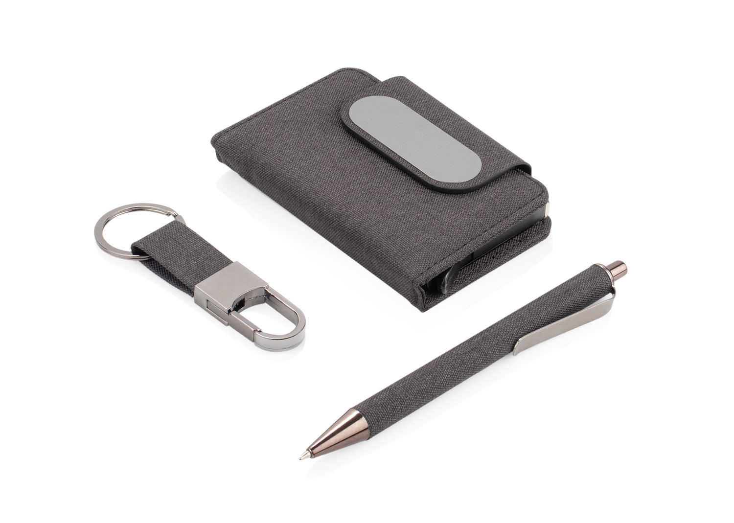 Set de oficina elegante y sostenible. Incluye tarjetero metálico forrado en tela RPET (7,3 X 10,5 X 1,7), bolígrafo de aluminio con detalle textil (14 X Ø 0,9 X 1,3) y llavero a juego (2 X 8,1 X 1), todo presentado en una caja de diseño sofisticado. Ideal para regalo corporativo. La billetera cuenta con un mecanismo RFID especial que bloquea la lectura no autorizada de tarjetas, protegiendo su información personal. MATERIAL: RPET + Aluminio MEDIDAS: Formato: (Ancho X Alto X Profundo): Estuche: (16,5 X 16,5 X 2). Peso: 227 gr. ÁREA DE IMPRESIÓN APROXIMADA: Screen: Tarjetero: (7 X 2). Tapa Estuche: (11 X 11). Láser: Tarjetero: (1 X 4). Llavero: (1,5 X 1,5). Bolígrafo: (3 X 0,5). MARCA: SE SUGIERE: Screen hasta 5 tintas. Láser. EMPAQUE: 100 Unidades en caja máster de: 39 cm x 30 cm x 68 cm; Peso Bruto: 13 Kg; Peso Neto: 14 Kg. EMPAQUE INDIVIDUAL: Cada pieza en bolsa OPP