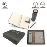 Set de libreta de 21 cm x 14.5 cm de 96 hojas rayadas. Con cubierta en poliuretano y clip con imán. Botilito de 380 ml doble pared Vacuum en acero inoxidable, con aislamiento térmico que mantiene la bebida fría o caliente hasta 6h aprox (puede variar dependiendo de las condiciones climáticas). Bolígrafo plástico tipo roller. Empaque caja individual. Medidas caja: 30 cm x 25.5 x 7.2 cm. Marca: Libreta: 5 cm / Tampografía / 1 cm / Láser Botilito: 4.5 cm / Tampografía en silicona a una tinta Bolígrafo: 3.5 cm / Tampografía.