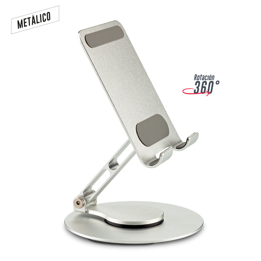 Soporte metálico plegable y escualizable con rotación de 360°. Accesorios antideslizantes en silicona. Empaque caja individual. Medidas Cerrado: 10.5 cm de diámetro x 2 cm Marca: 3 cm / Láser