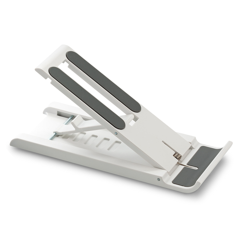 Soporte Portátil plegable plástico. Ligero, con ajuste de altura en la parte posterior y puntas antideslizantes. Se sugiere usar en dispositivos de hasta 7 pulgadas. Empaque caja individual. Medidas Cerrado 12 cm x 4.9 cm x 1 cm Marca: 2.5 cm / Tampografía
