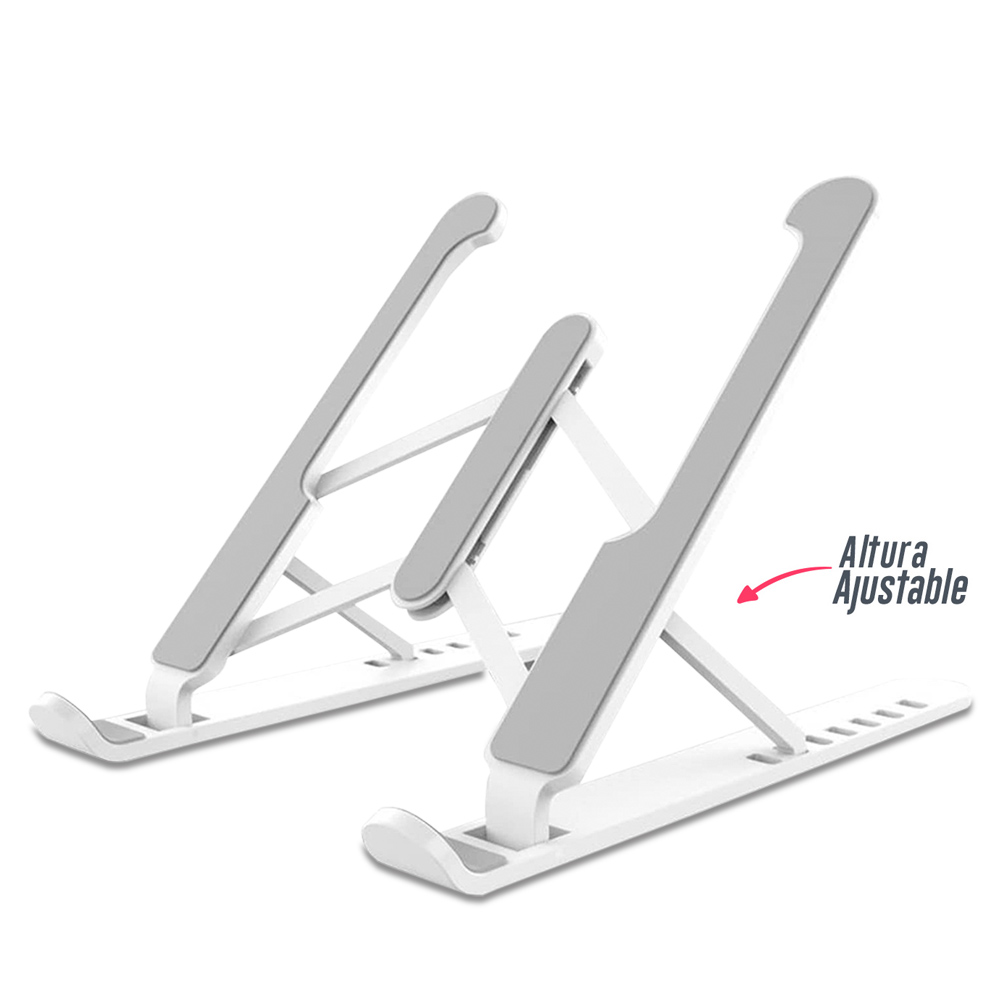 Soporte Portátil Plegable plástico. Ligero, con ajuste de altura en la parte posterior y puntas antideslizantes. La posición del dispositivo sobre el soporte ayuda a que no se recaliente, mejora la posición de la columna vertebral y reduce la fatiga de cuello, espalda y ocular. Se sugiere usar en dispositivos entre 10 y 15 pulgadas. Con funda para cargar y caja individual. Medidas: 26.5 cm x 6 cm x 2 cm Marca: 5 cm / Tampografía